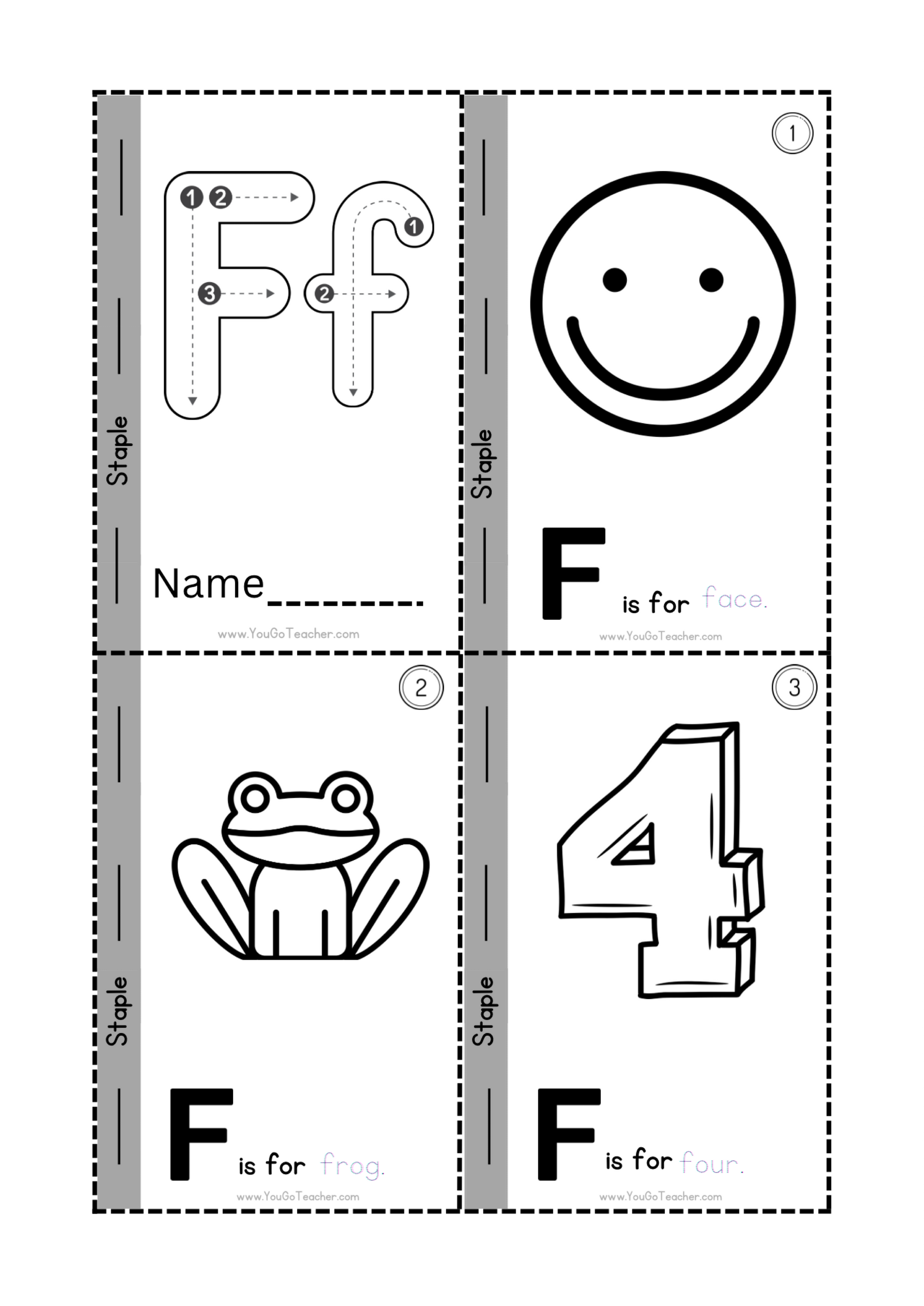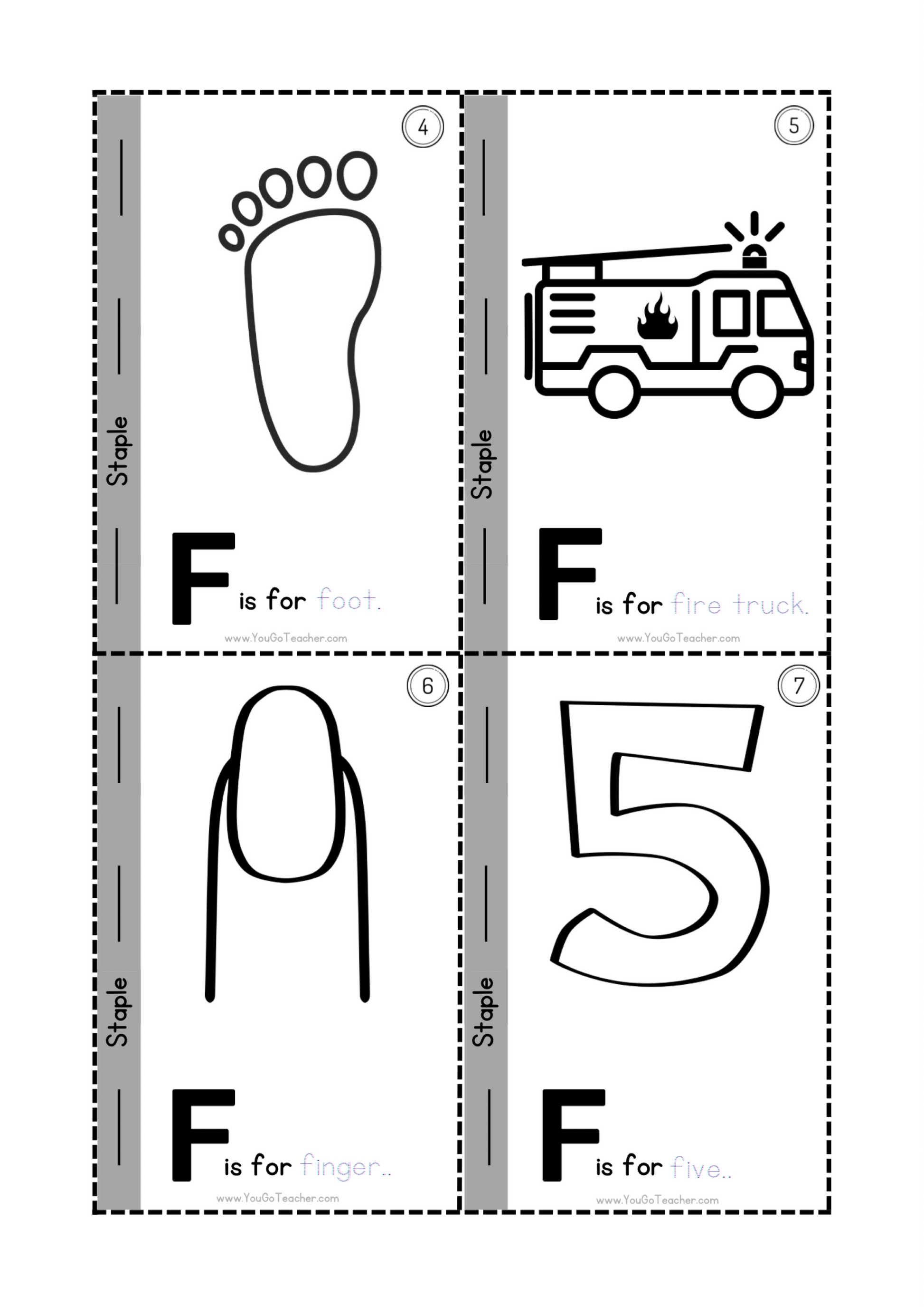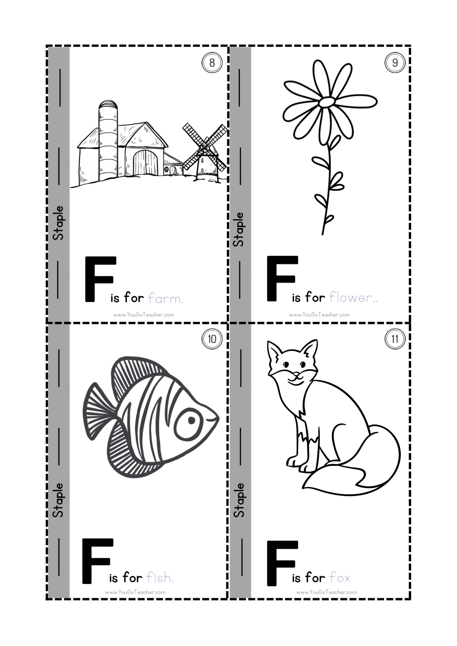 This booklet includes a total of 6 black and white pages. Children can trace the letter ‘F’ as well as words hat begin with letter F. This tracing activity can also be transformed into a coloring book. The black and white pages are great for printable worksheets. Laminate the color pages for repeat use with washable or dry-erase markers.
