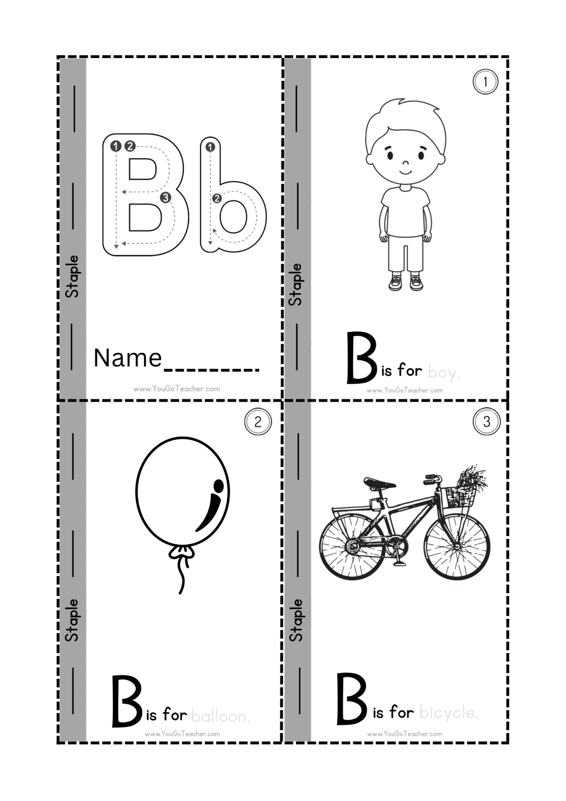 This booklet includes a total of 6 black and white pages. Children can trace the letter ‘B’ as well as words hat begin with letter B. This tracing activity can also be transformed into a coloring book. The black and white pages are great for printable worksheets. Staple the pages together and create a booklet that students can carry around forever.