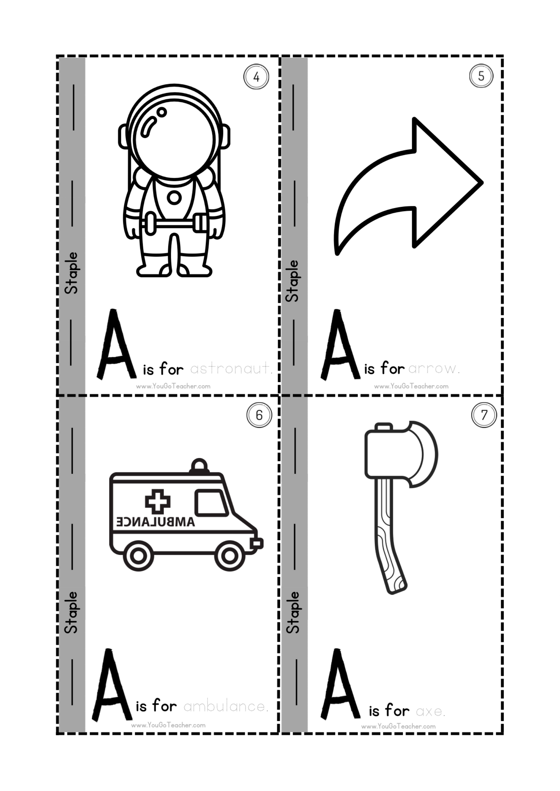 This booklet includes a total of 6 black and white pages. Children can trace the letter ‘A’ as well as words hat begin with letter A. This tracing activity can also be transformed into a coloring book. The black and white pages are great for printable worksheets. Staple the pages together and students carry the booklet around forever!